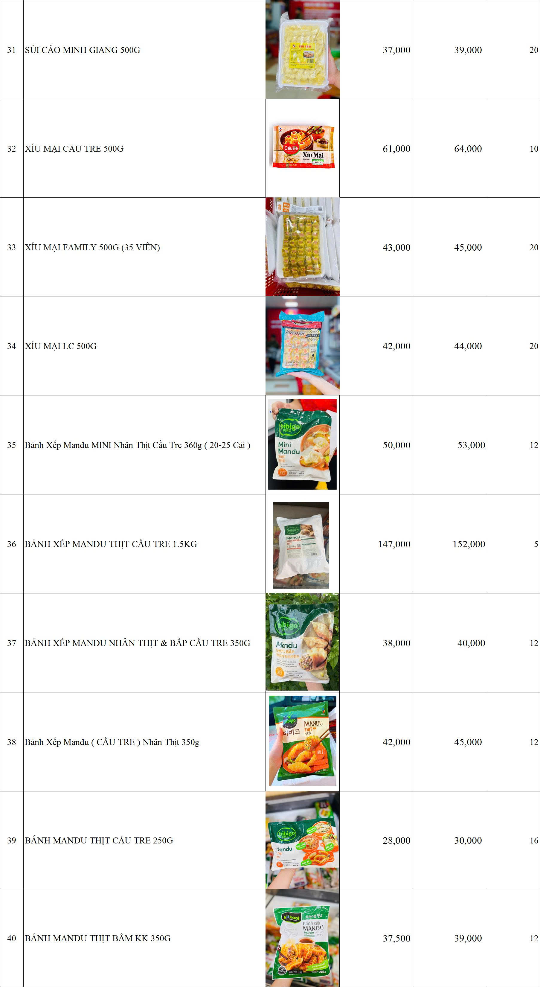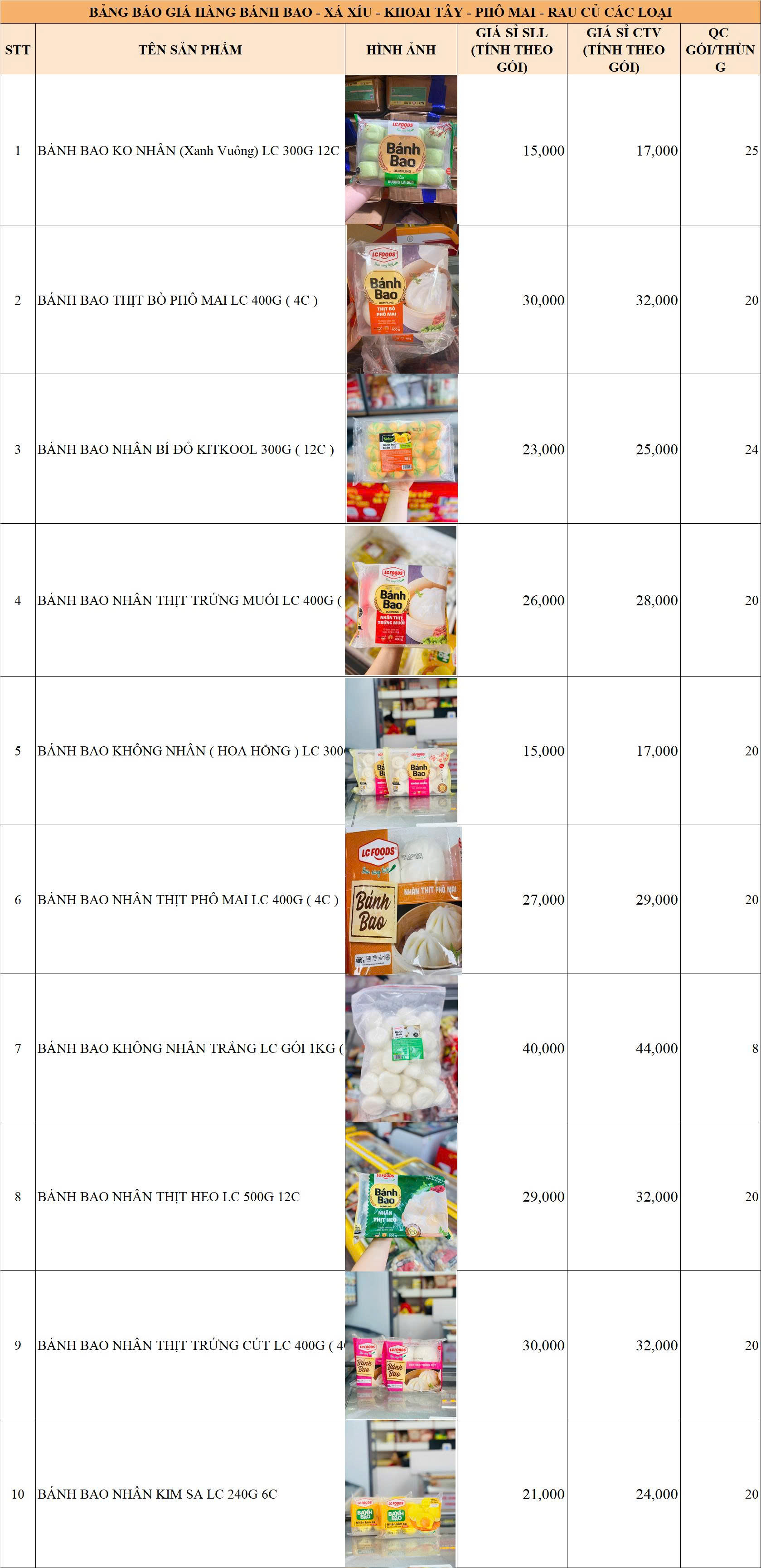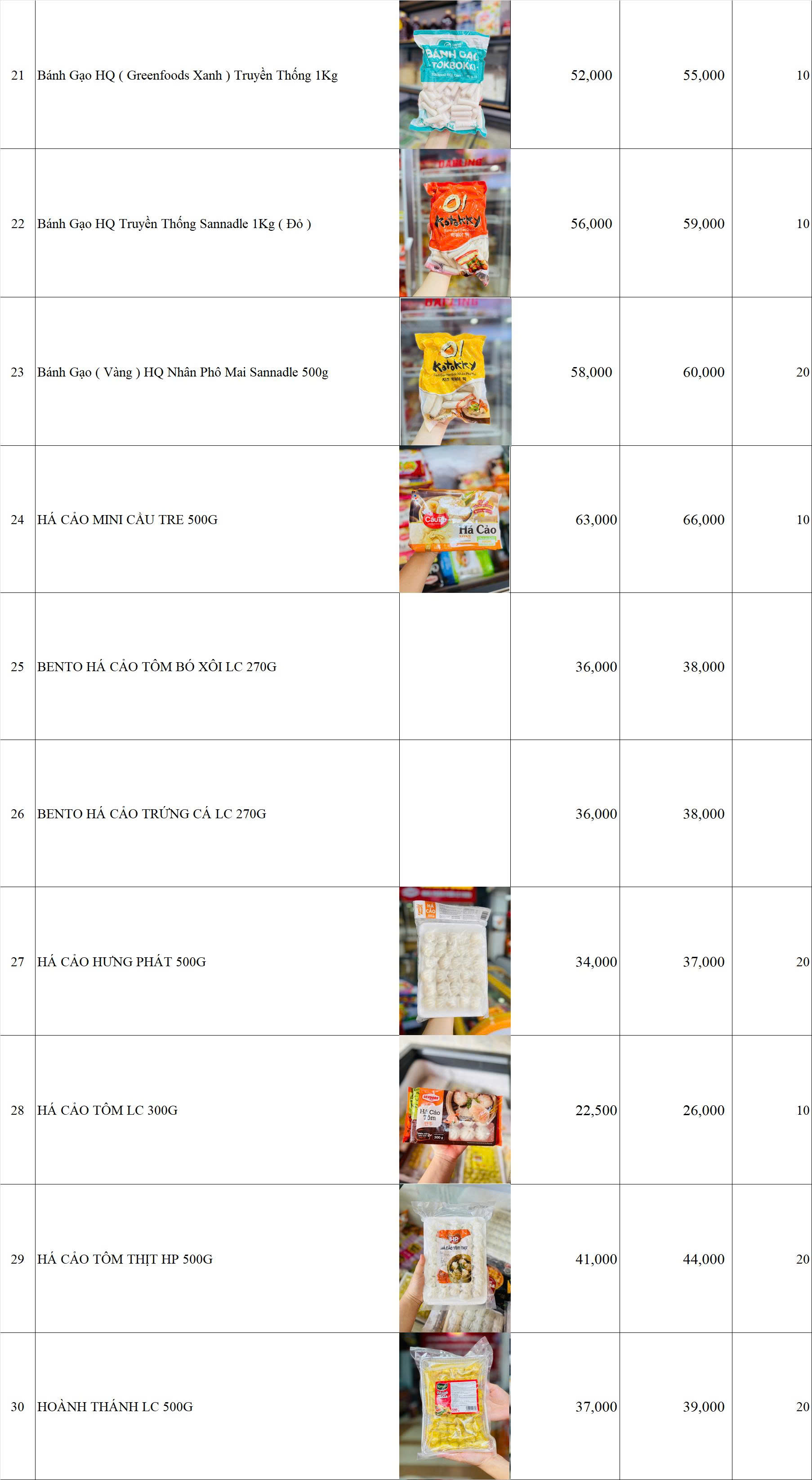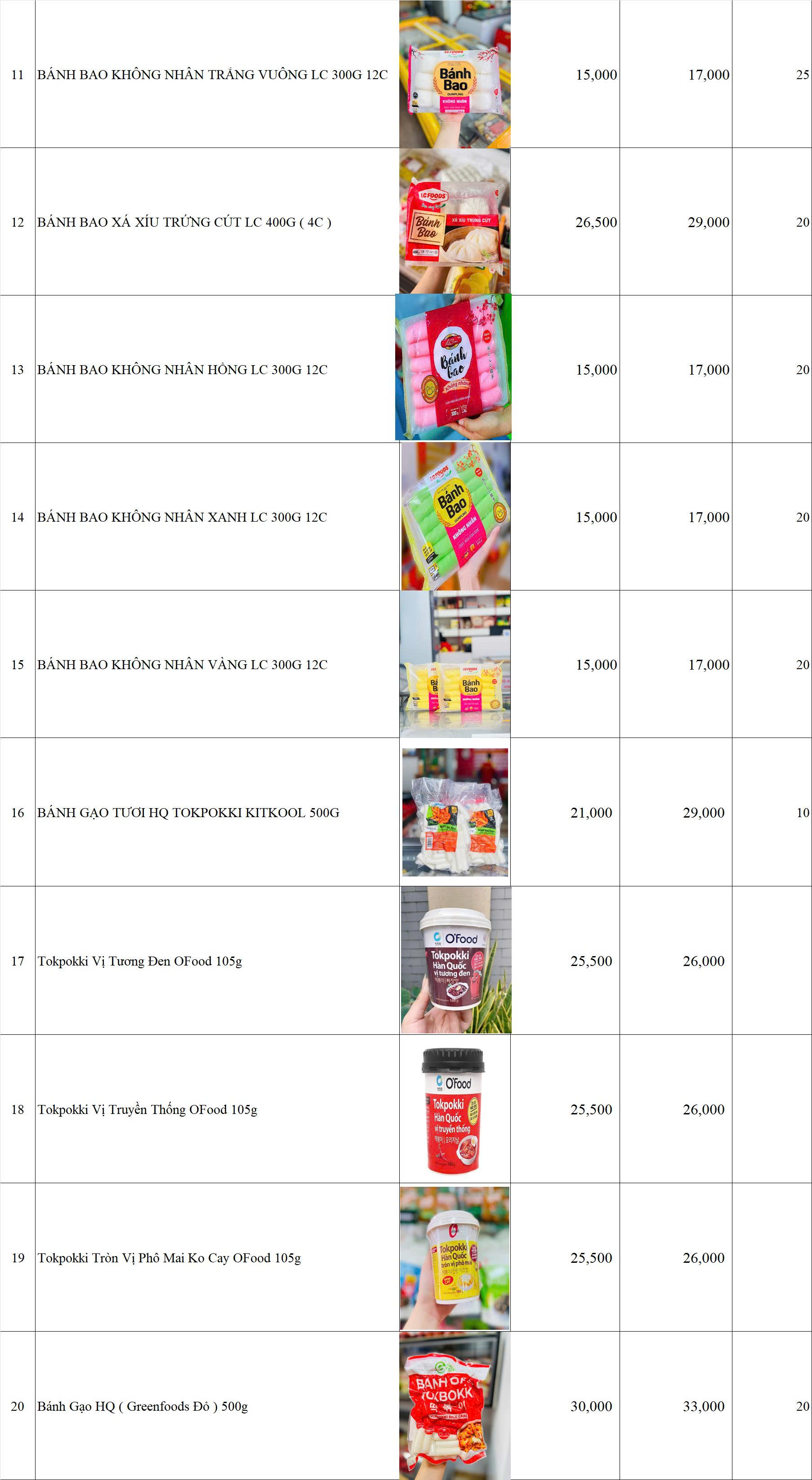 BẢNG GIÁ HÀNG BÁNH