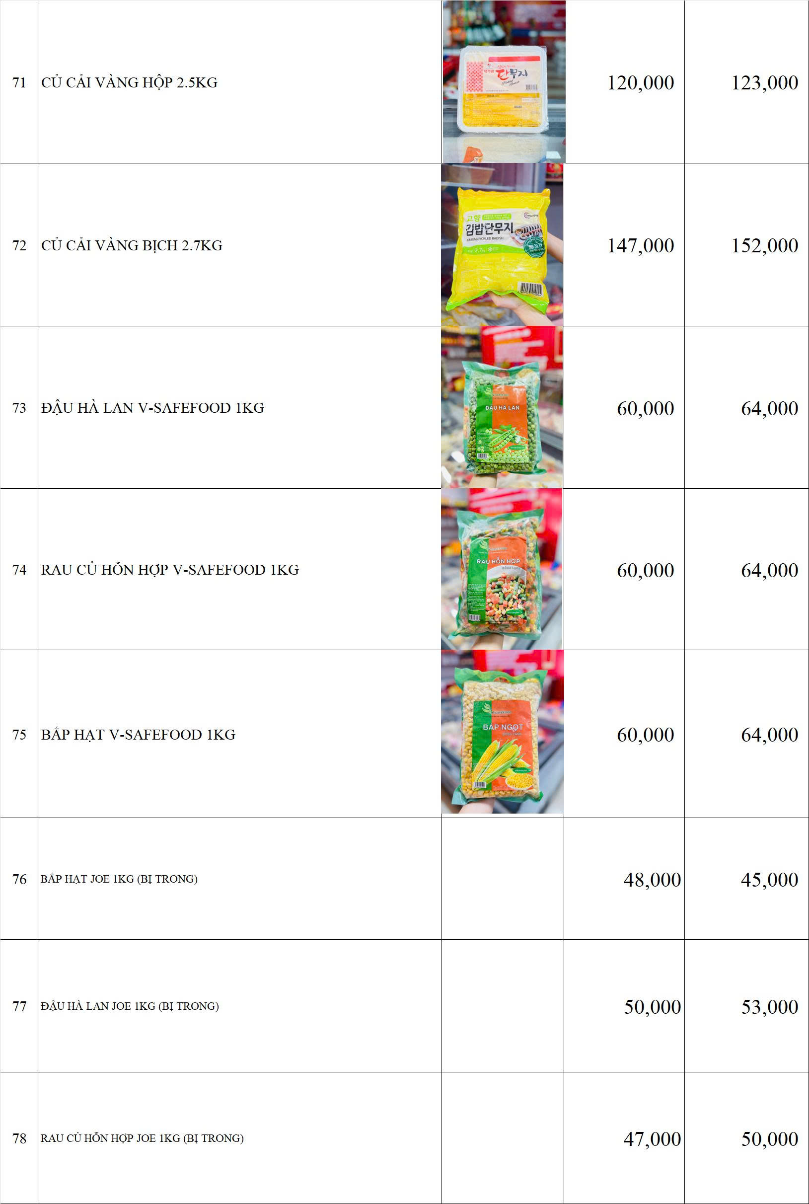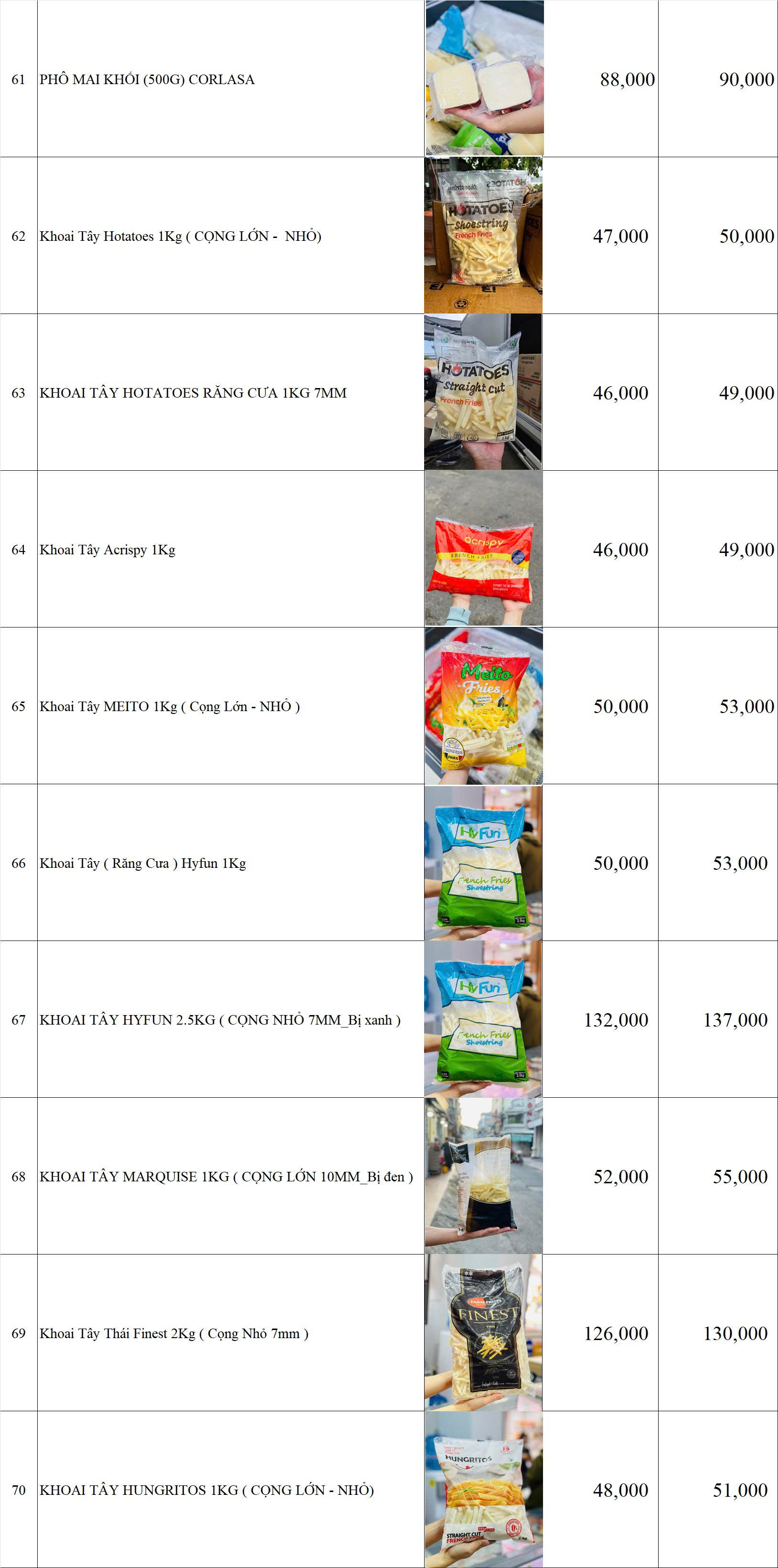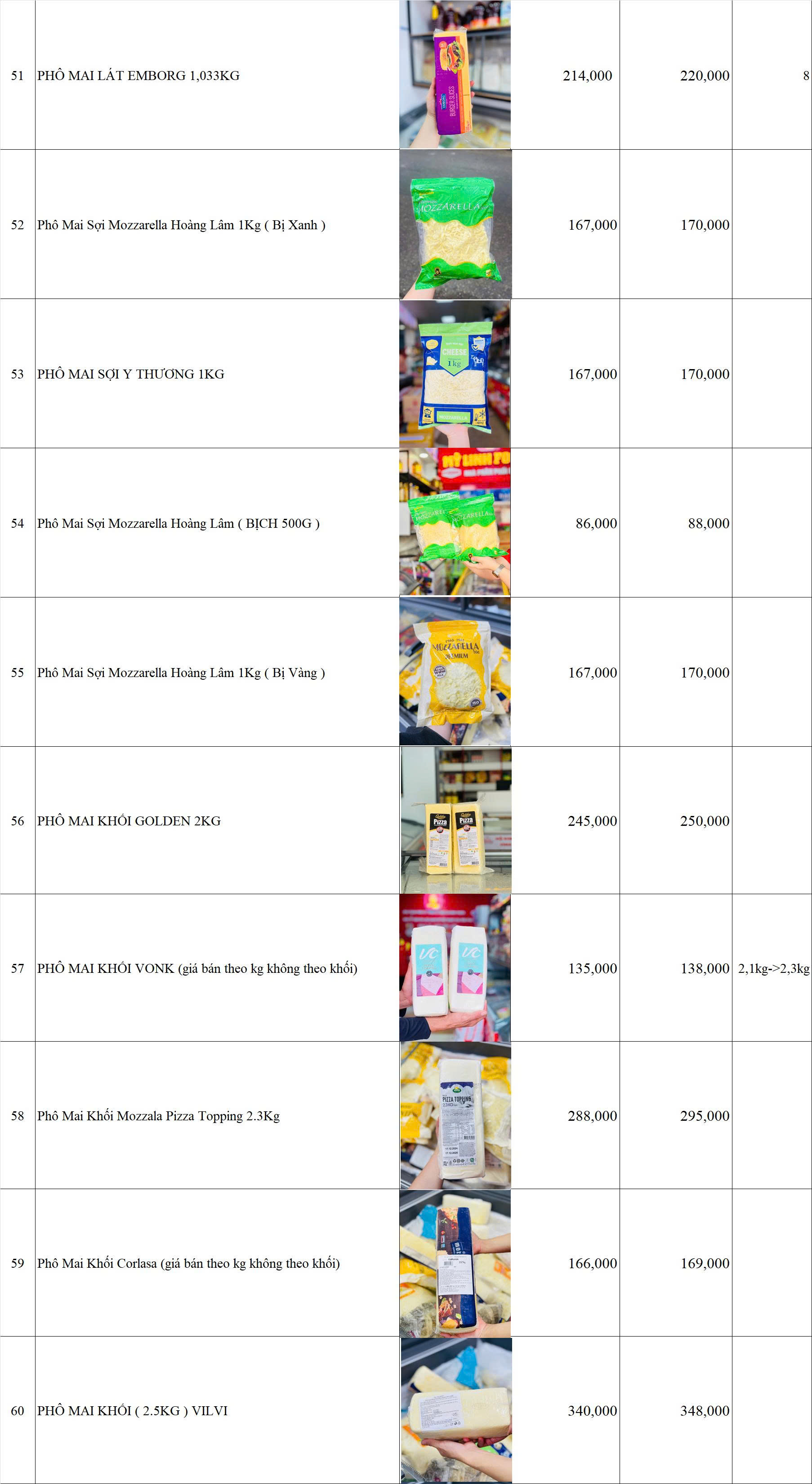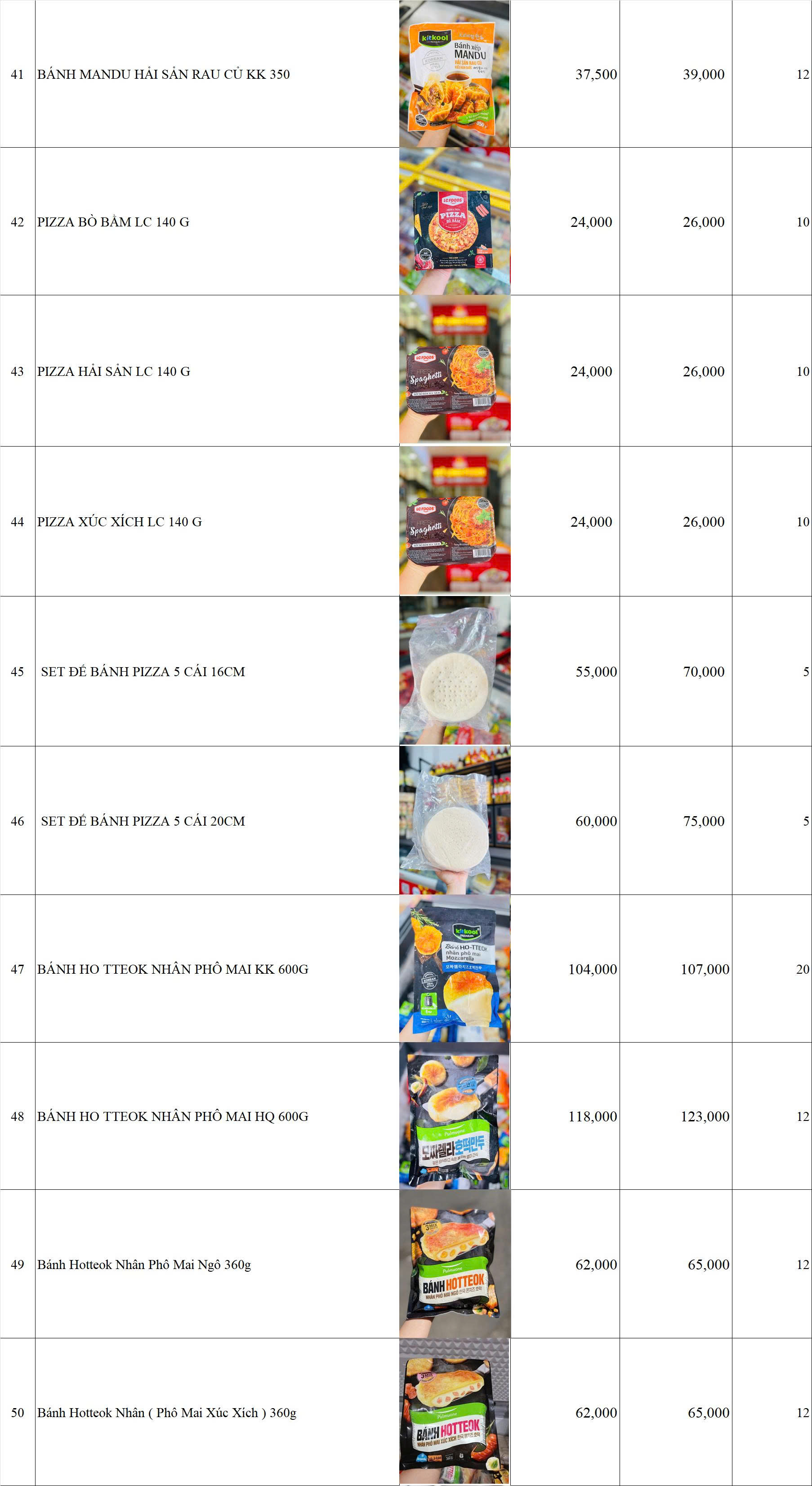 BẢNG GIÁ HÀNG BÁNH