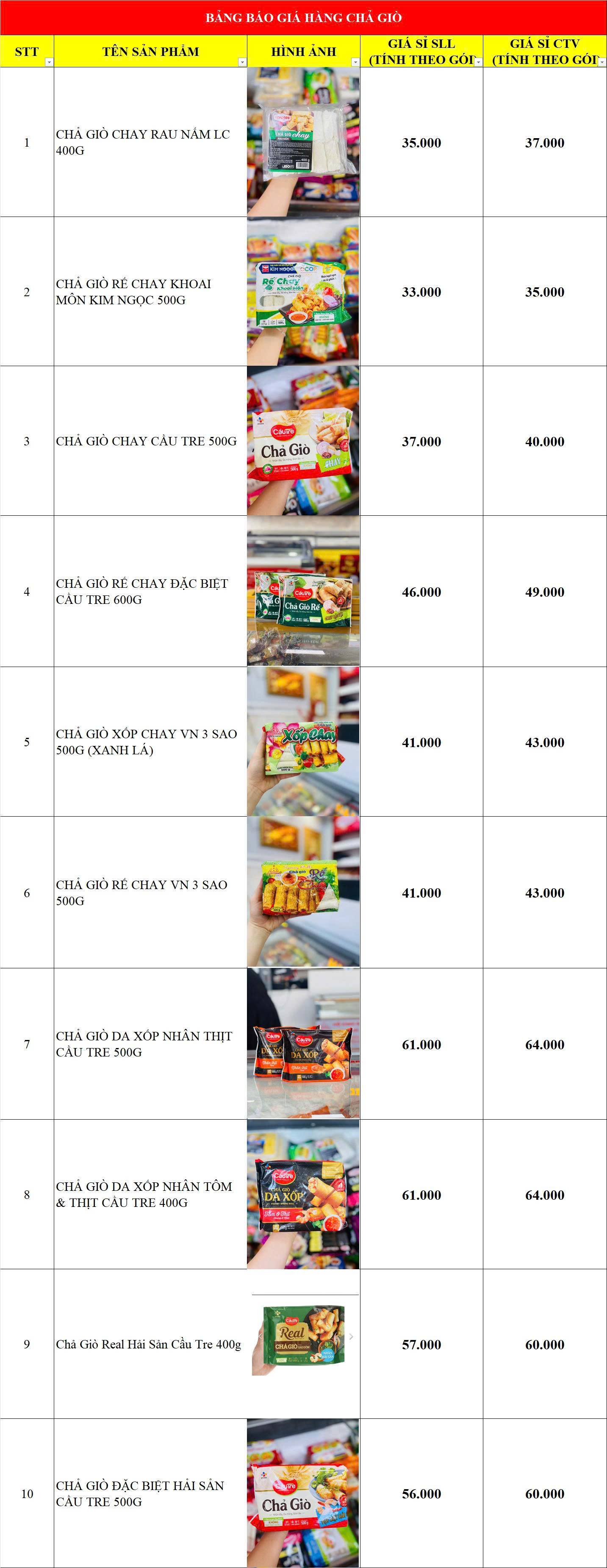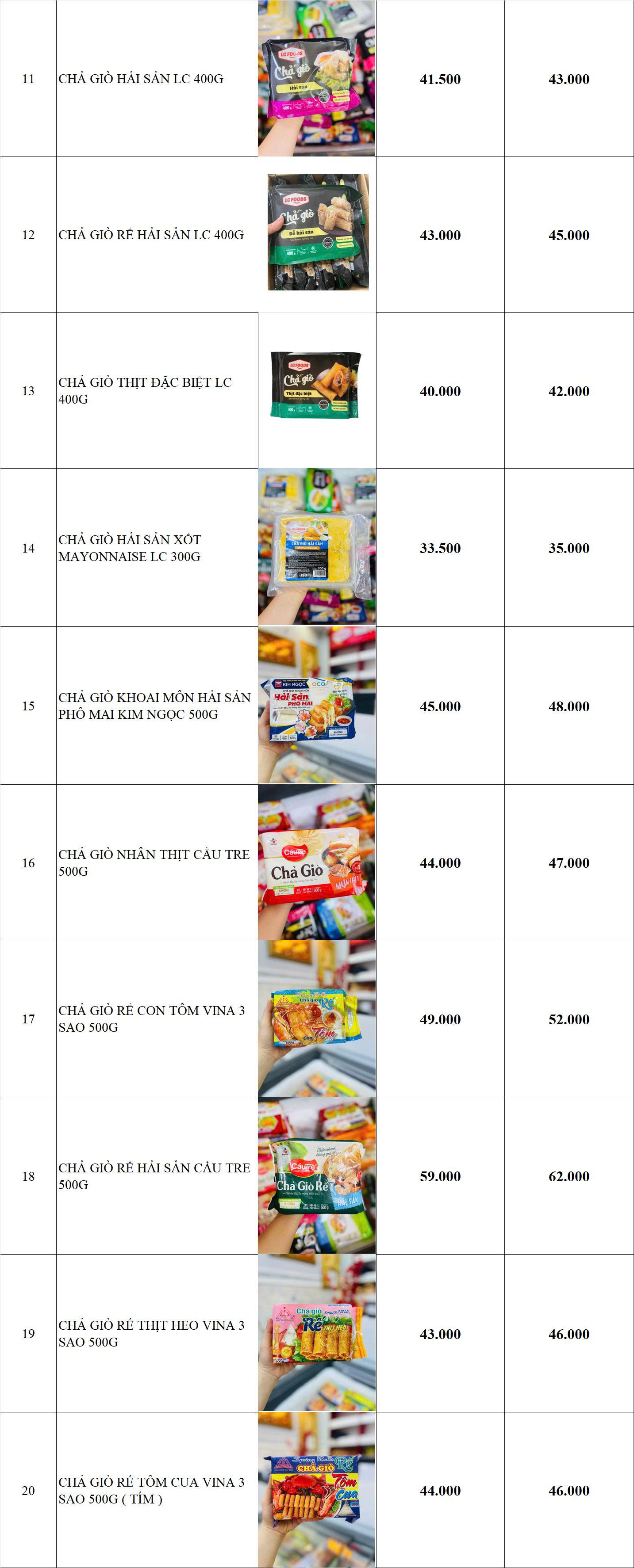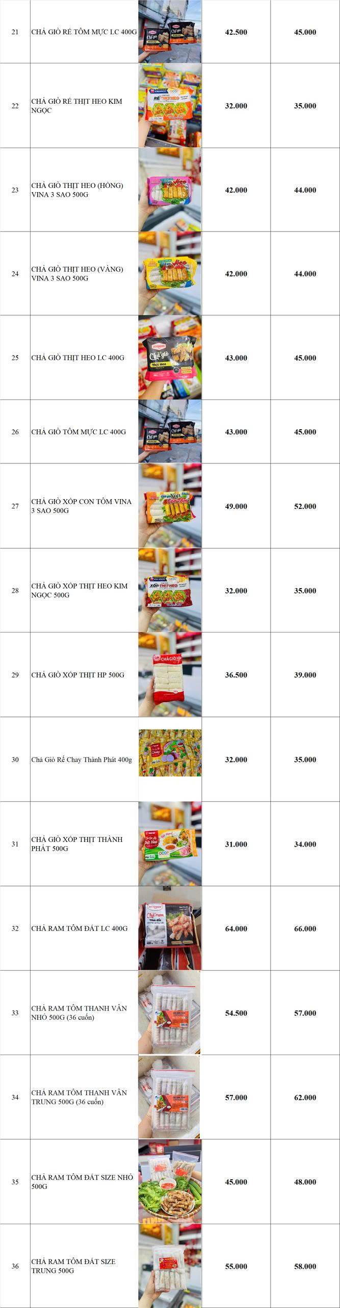 BẢNG GIÁ HÀNG CHẢ GIÒ