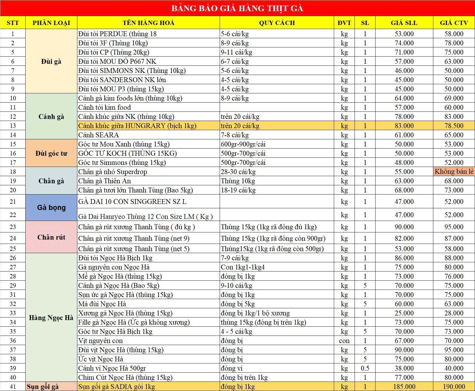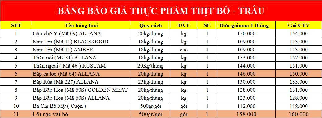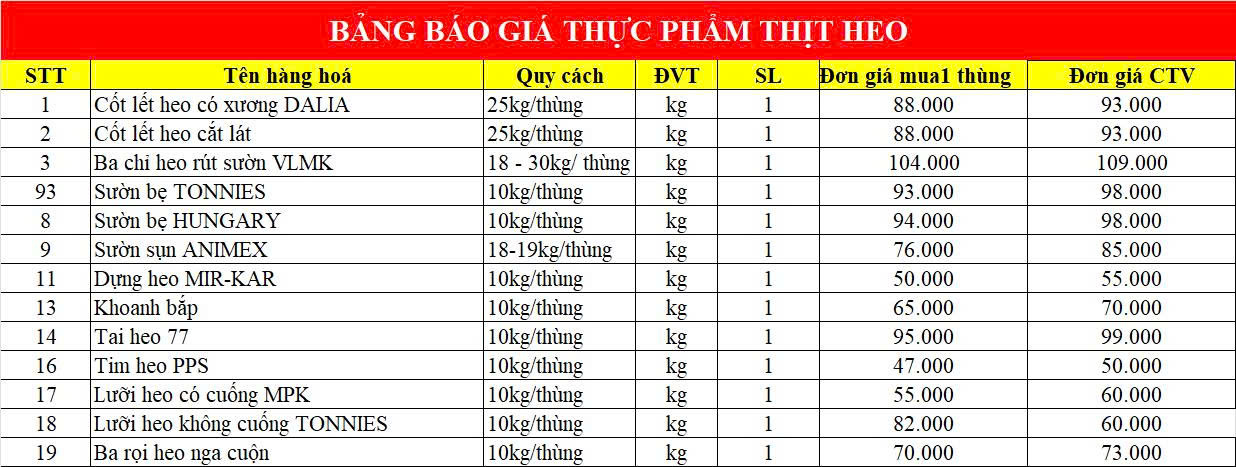BẢNG GIÁ SỈ HÀNG THỊT
