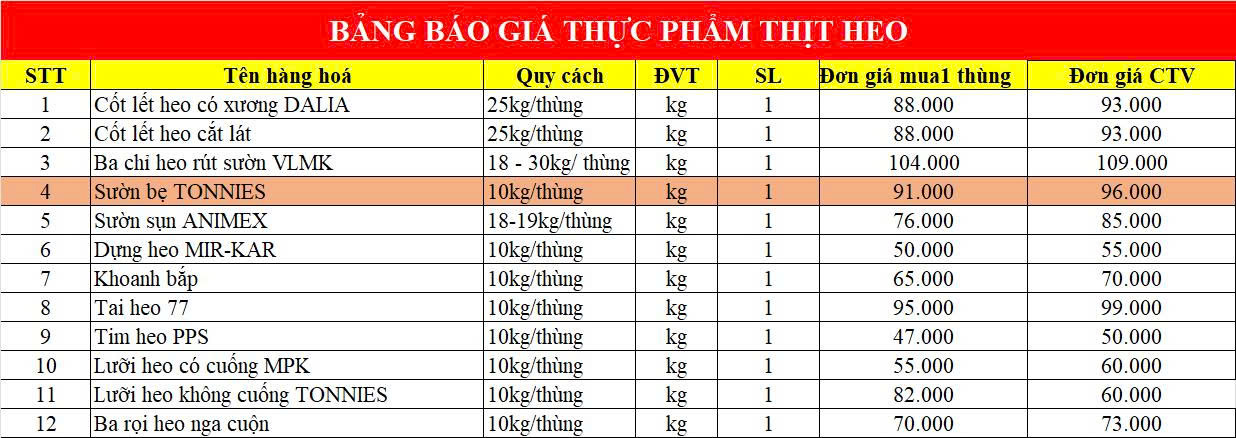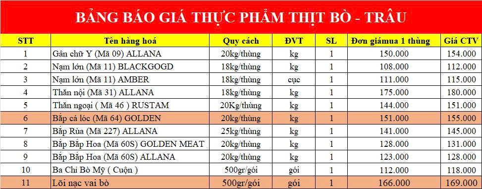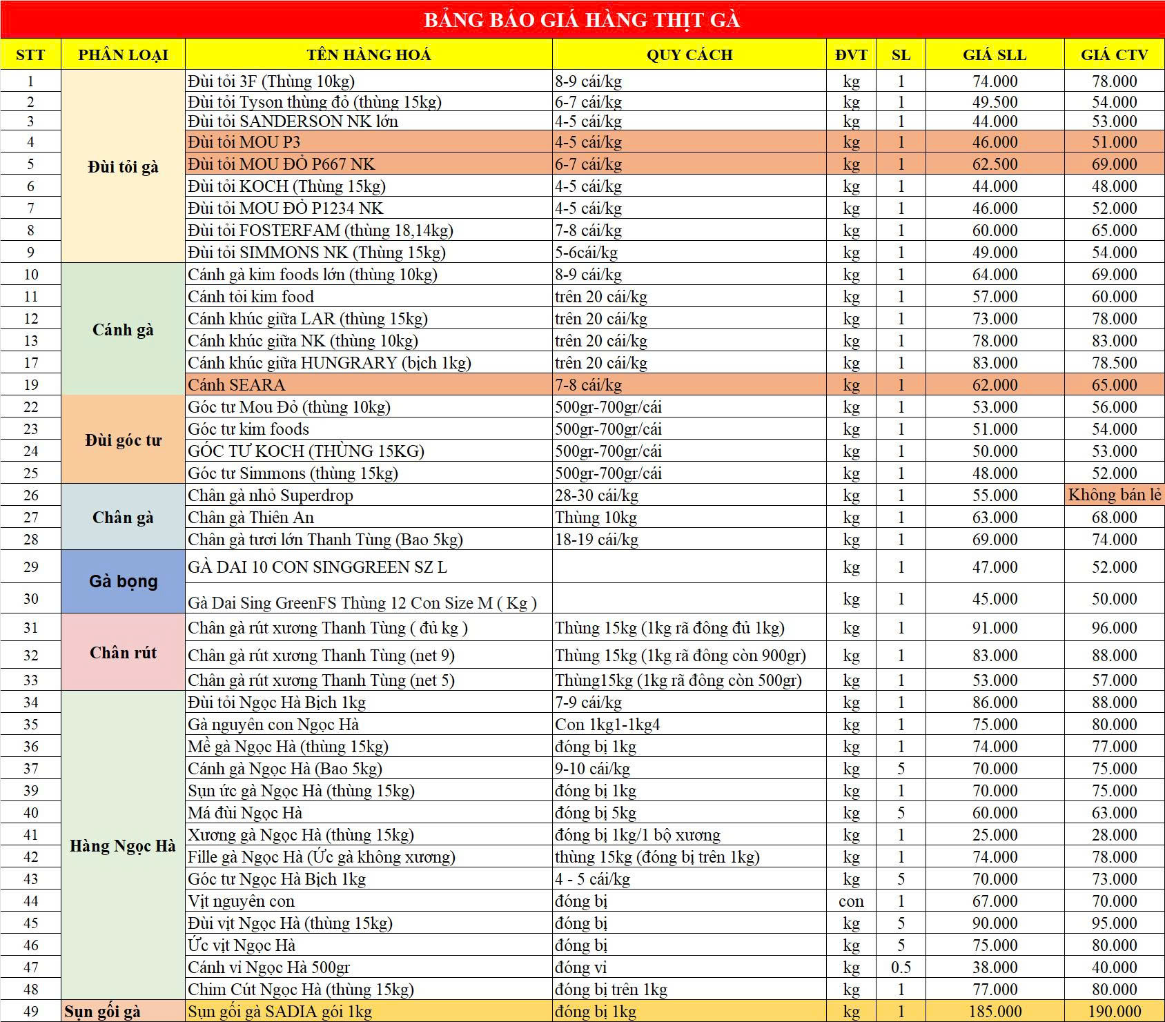 BẢNG GIÁ SỈ HÀNG THỊT GÀ - HEO - BÒ - TRÂU